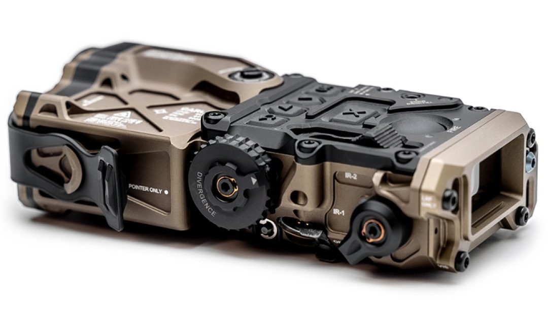A Class 3B/3R combination high-power infrared aiming and illumination device with visible pointer, as well as range-finding ballistic computer (via the Applied Ballistics™ integrated software) that can both provide holds on-screen for use with a day-optic or actively declinate the disturbed infrared aiming laser for ballistic compensation when using head-borne night vision devices.