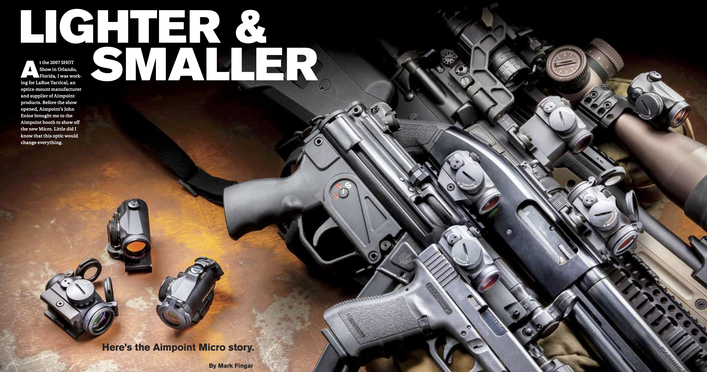 The Birth of a Legend. According to Enloe, Aimpoint USA received the first prototypes of the Micro in the summer of 2006. Initially, the Micro was intended for submachineguns, PDWs, the occasional shotgun, and maybe a pistol or two. During testing, the Micro was added to every practi-cal application they could conceive. “With the exception of height, it worked well on every platform,” said Enloe. “For the height issue, we reached out to the mount industry.”