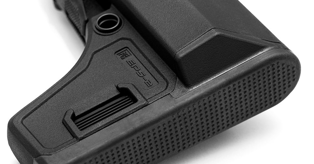 The EPS-2 also incorporates our stock pull adjustment lever first seen on our EPS-C compact stock which features a fixed center ridge to prevent accidental activation and collapse. To extend or collapse the stock, one should use a fist or beer can grip and the fingers will press on the lever side opposite to your palm. Removing the stock is greatly simplified by merely pressing down on the rear of the lever so no more struggling with small heavily sprung levers like on other stocks.